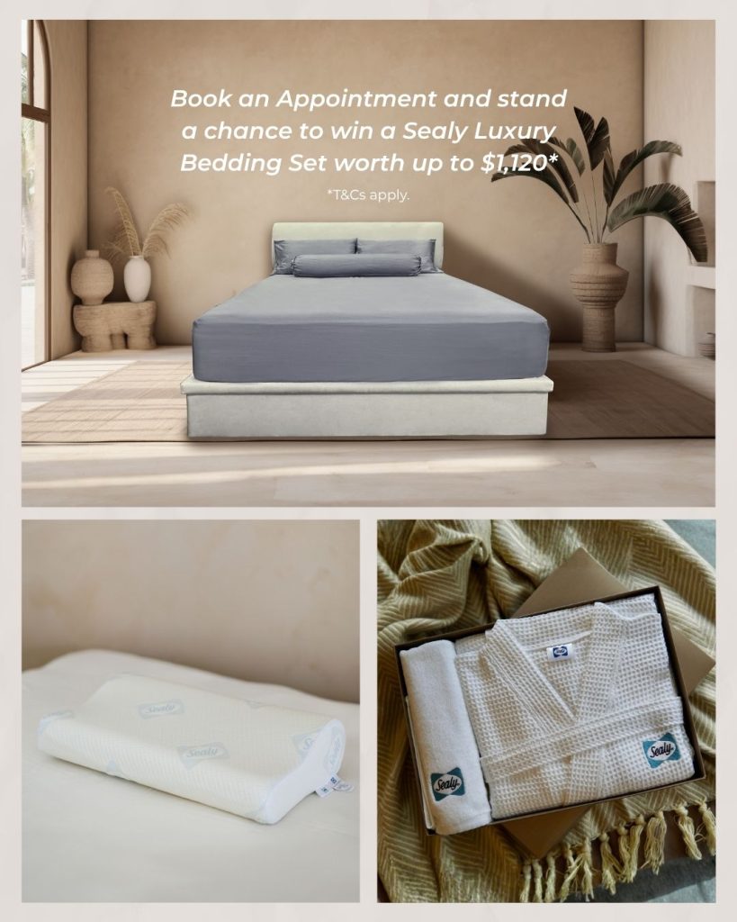 Find your perfect bed with our 1-on-1 Sealy Sleep Consultation and walk away with guaranteed credits, instant gifts and a chance to win up to $1,120 worth of Sealy Luxury Bedding Set!