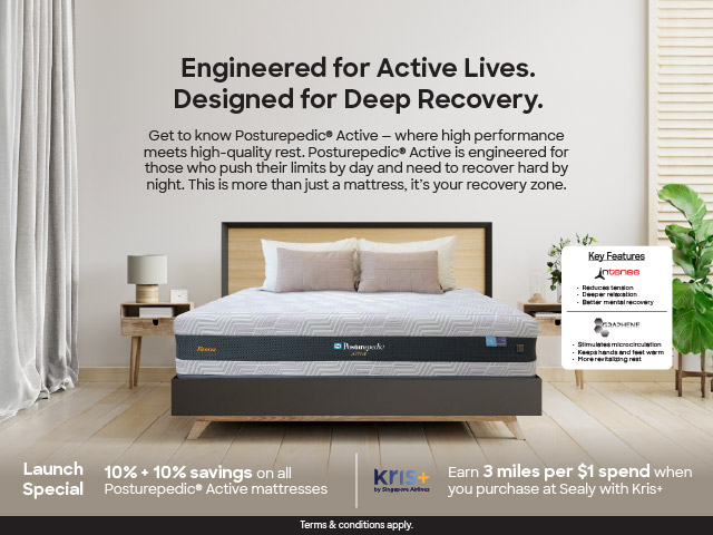 Enjoy 10% + 10% savings for our all-new Posturepedic® Active mattresses! Earn 3 miles per $1 spend when you purchase at Sealy with Kris+. T&Cs apply.